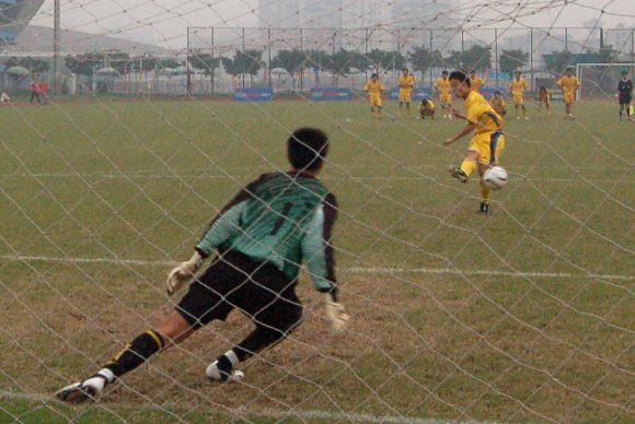 点球决战异常残酷,前五轮罚球,双方各射失一球,开始进入单轮罚球决胜后,双方又都各进一球。罚球进行到了第七轮时,对方队员似乎想声东击西,但在巨大的压力之下动作变形,竟然将球打飞,只要我方再进一球,就将创造历史。
