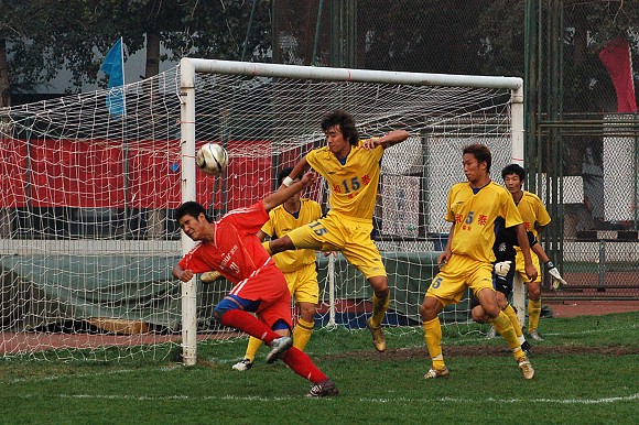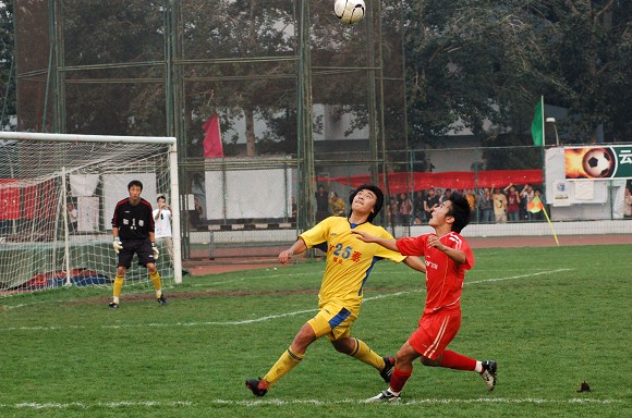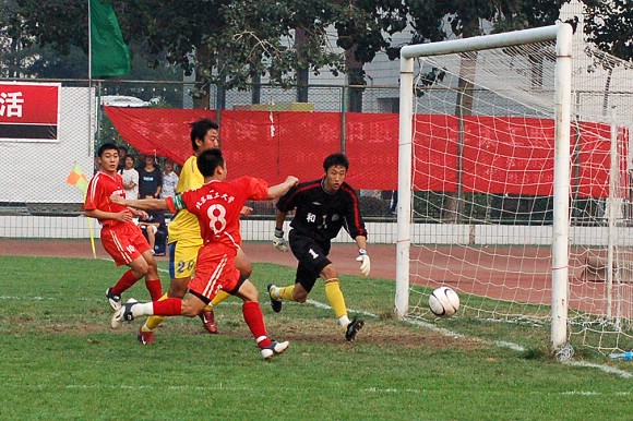 天津火车头队的队员身高优势化解了北京理工大学足球队的一次次反攻。