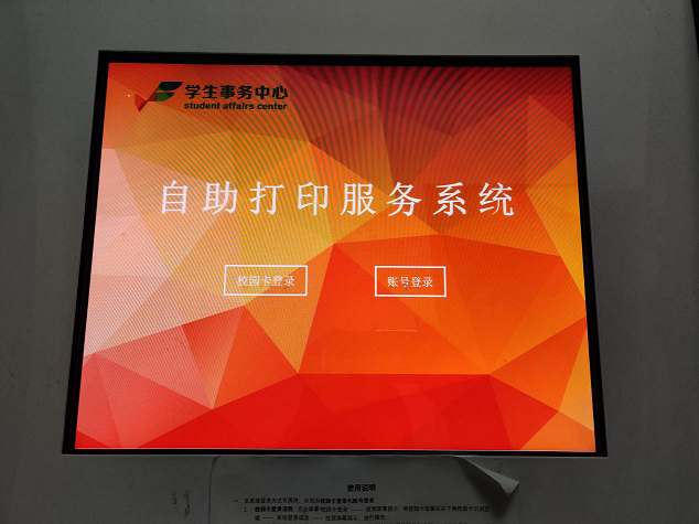 第二步:在自助打印设备上选择登录(校园卡登录和账号登录均可)——按照屏幕提示点击完成打印。