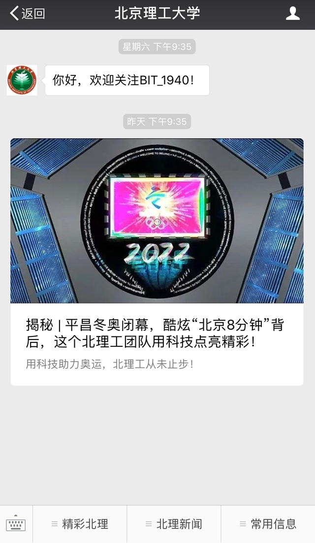值得一提的是,25日,作为“北京理工大学微信订阅号”发出的第一条推送《揭秘 | 平昌冬奥闭幕,酷炫“北京8分钟”背后,这个北理工团队用科技点亮精彩!》,获得了“10万+”的阅读量。