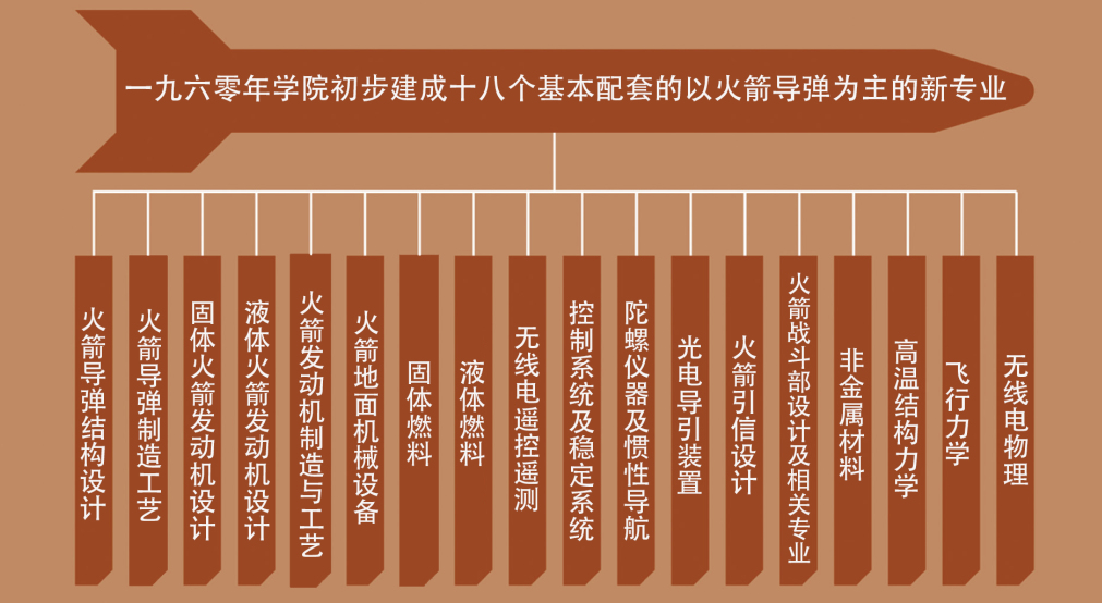 从1958年建立新中国第一批火箭导弹专业,到1960年初步建成18个以火箭为主的新专业和若干研究所,北京工业学院形成了完整的火箭系统教学科研体系。