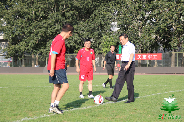 9月19日下午,在北京理工大学喜迎校庆75周年的日子里,首届“校庆杯”足球邀请赛在东操场举行。参赛的一方由北京理工大学老校友元老队加上北理工学生足球队的部分队员组成,另一方是由北京理工大学首届“军工杯”足球邀请赛的九支参赛队中精英组成的军工骄子联队。北京理工大学校长胡海岩院士,原北京市副市长、老校友范伯元教授,北理工足球队总顾问金志扬教授,北京理工大学副书记副校长项昌乐教授等参加了比赛揭幕仪式并与双方队员合影留念。